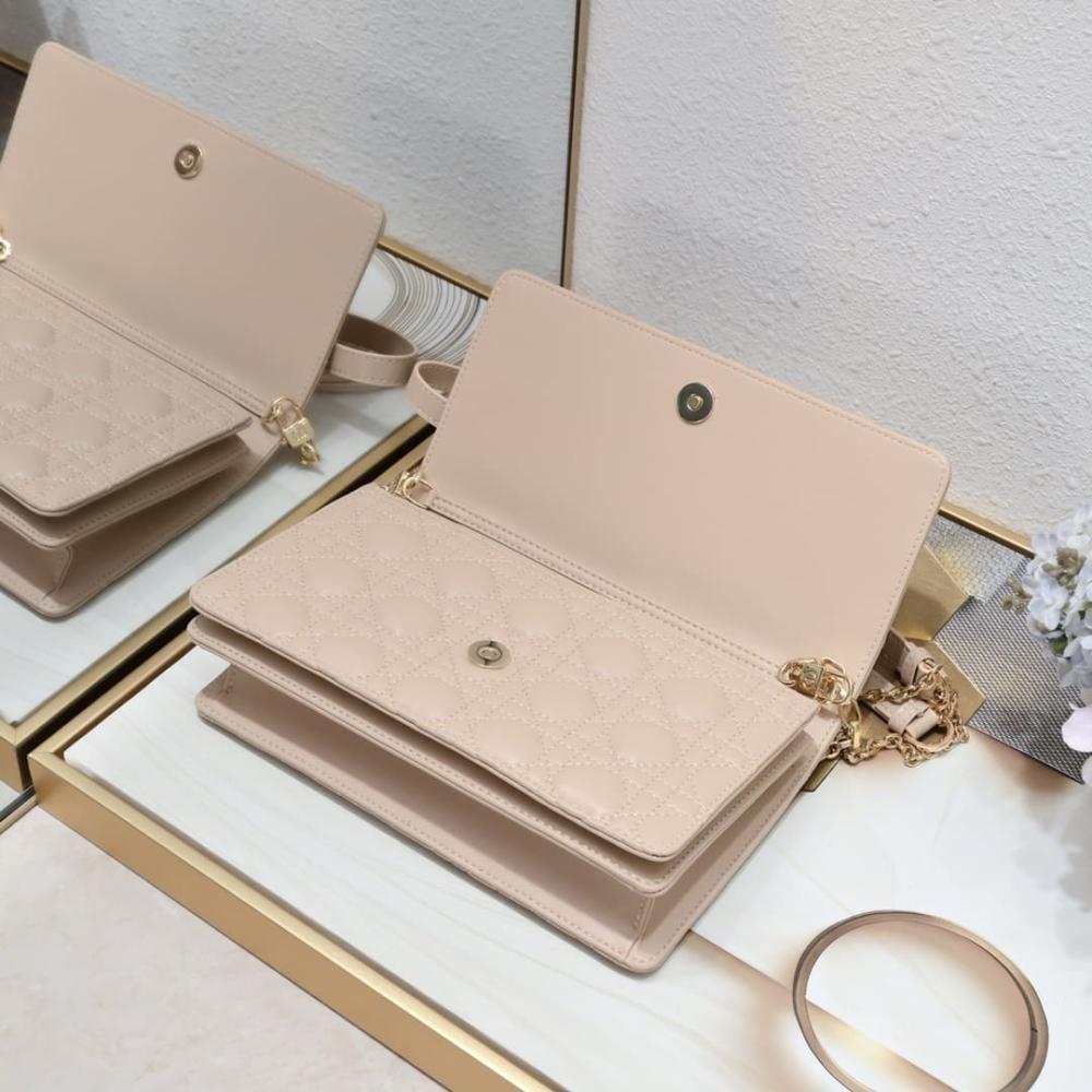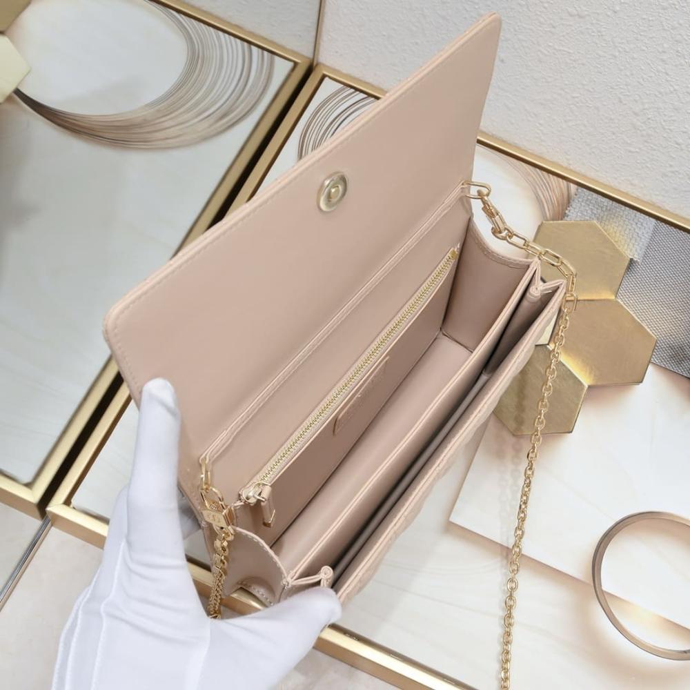 يزدان غطاؤها القلّاب بأحرف D.I.O.R الزينية المميزة، بينما يكتمل التصميم بلمسة مبتكرة مع سلسلة أنيقة تضفي على الحقيبة جاذبية استثنائية، وتجعلها قطعة تليق بأرقى الإطلالات.