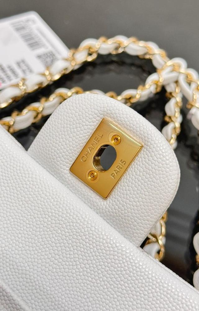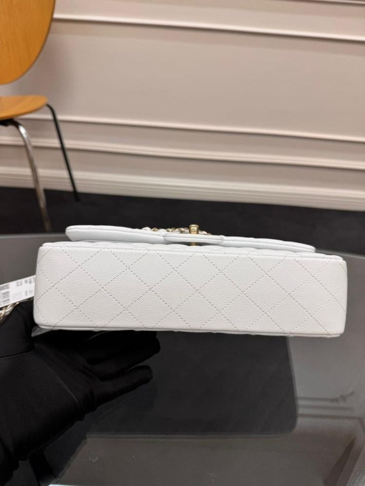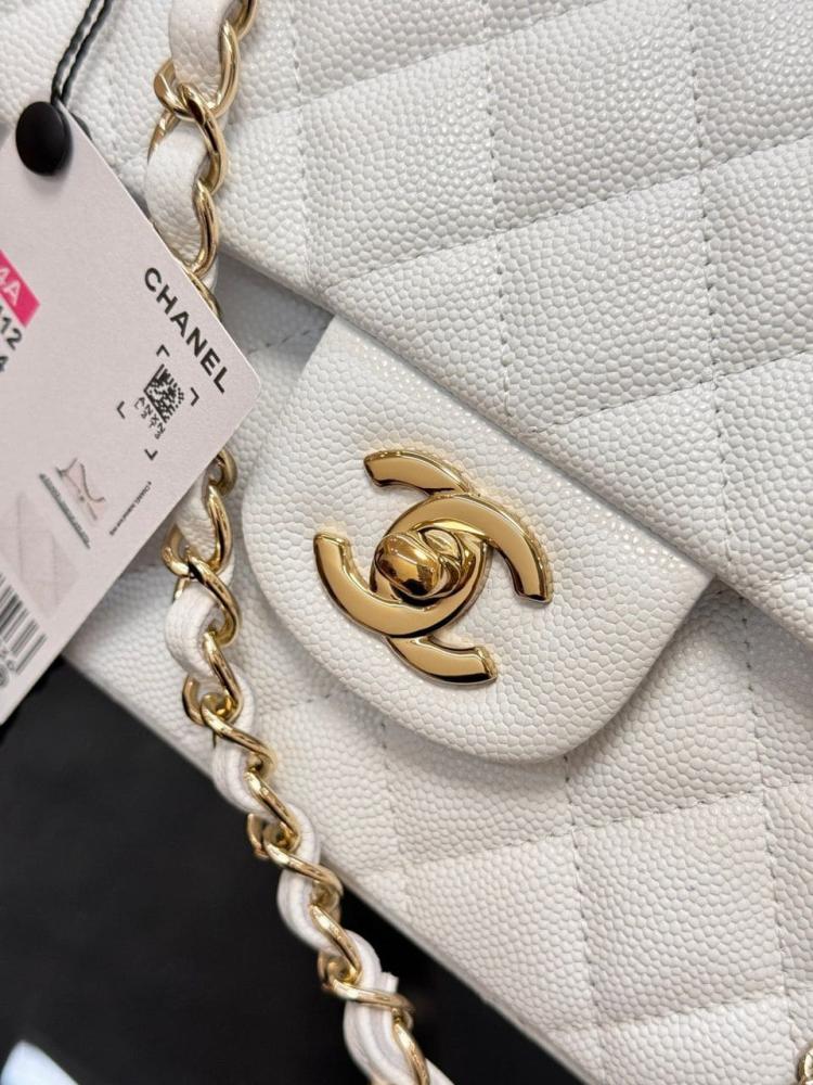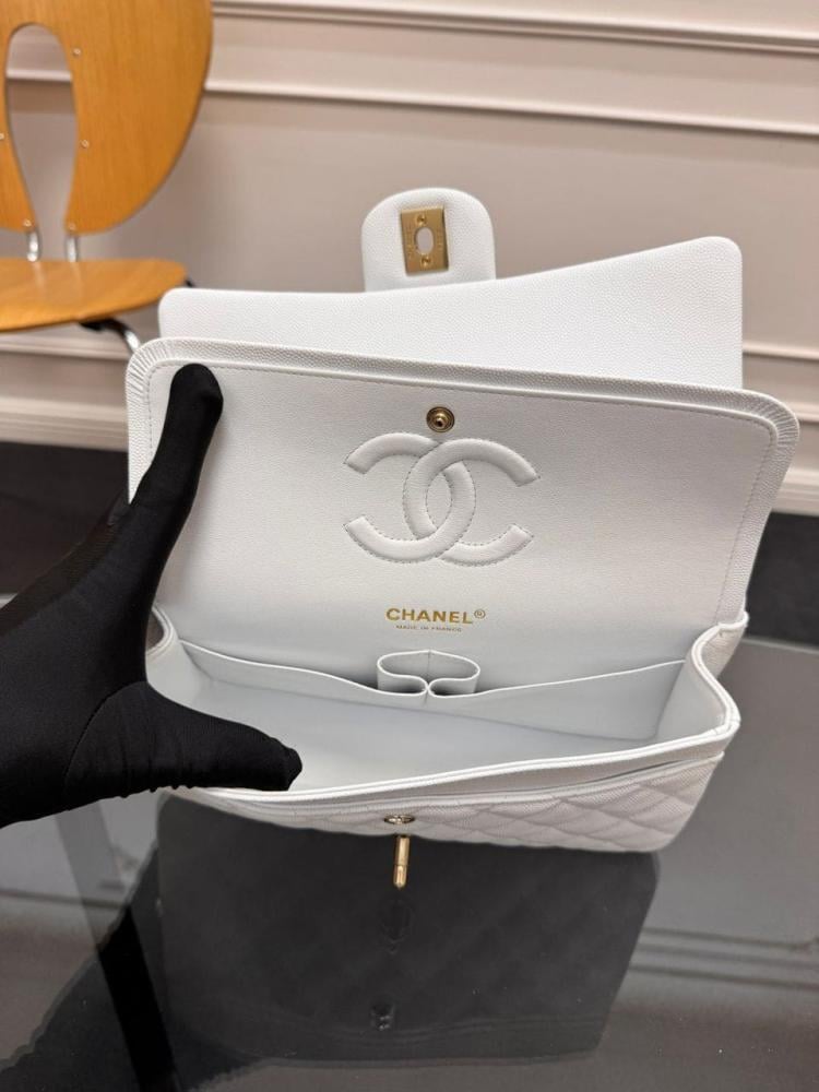 شانيل كلاسيك فلاب متوسطة مستوحى من جلد الكافيار الأبيض مع هاردوير ذهبي تألقي بأيقونة الموضة الخالدة من شانيل، الحقيبة التي تجسد الفخامة والأناقة العصرية في كل تفاصيلها، لتكون استثمارًا يرافقك لسنوات طويلة.